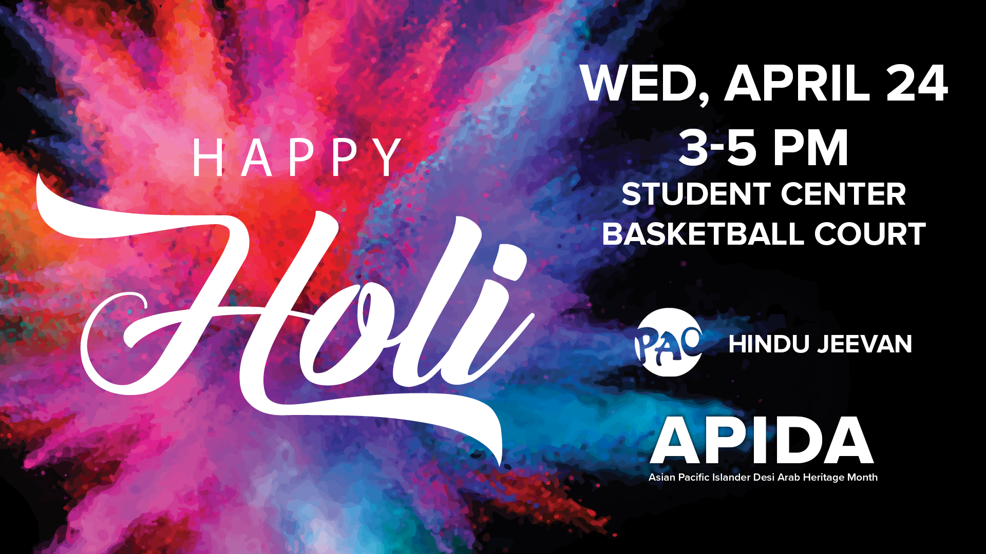 Asian Pacific Islander Desi Arab (APIDA) Heritage Month is observed in the United States during the month of May. I was selected to work on the branding for APIDA month by the marketing director Kim Sekas. I was asked to create various assets, such as social media posts, posters, and design a website. APIDA month also had a special event called HOLI, which I also designed graphics for.